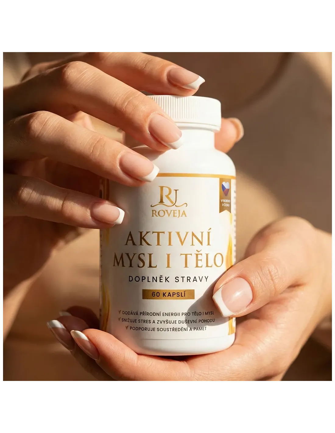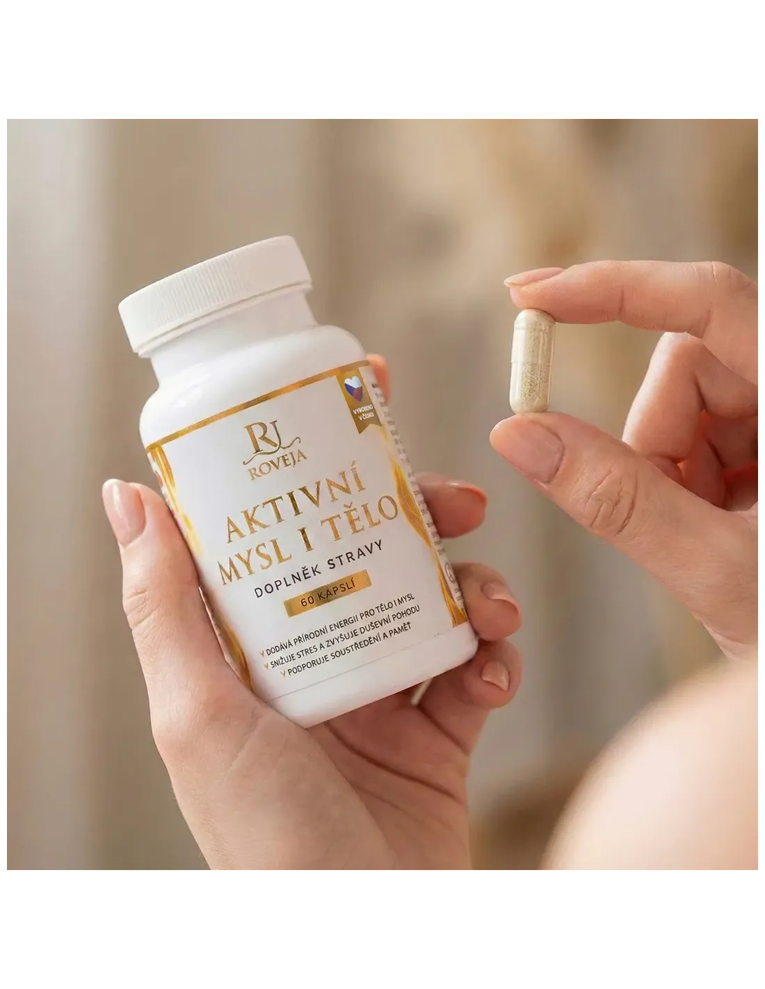 Žena drží kapsli doplňku Aktivní mysl i tělo od Roveja, která symbolizuje mentální energii, soustředění a podporu nervové soustavy