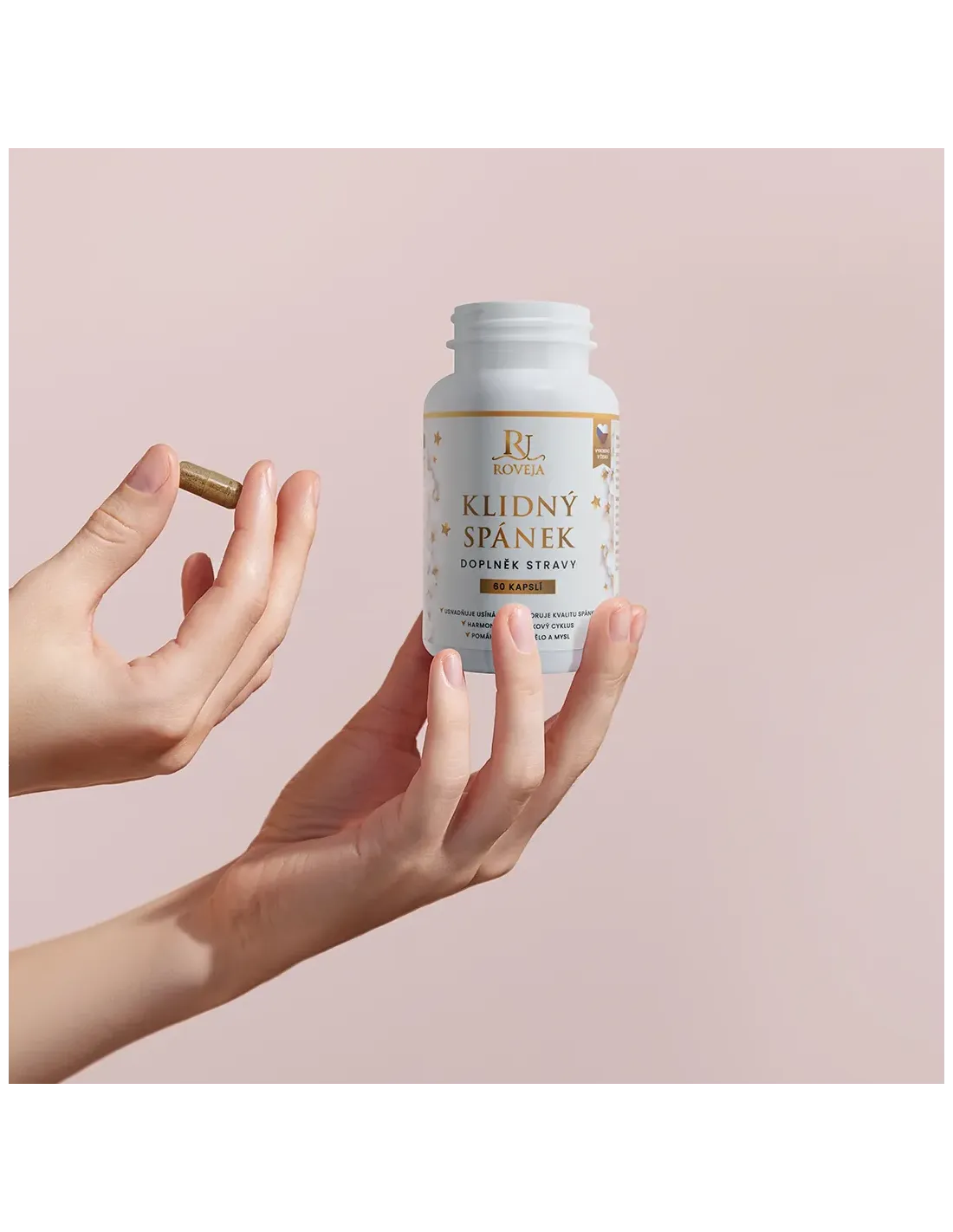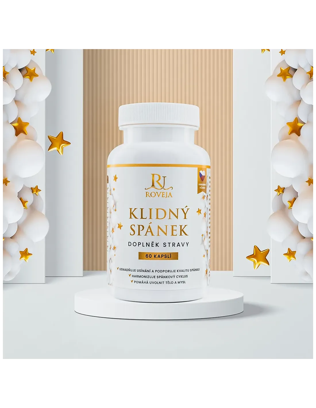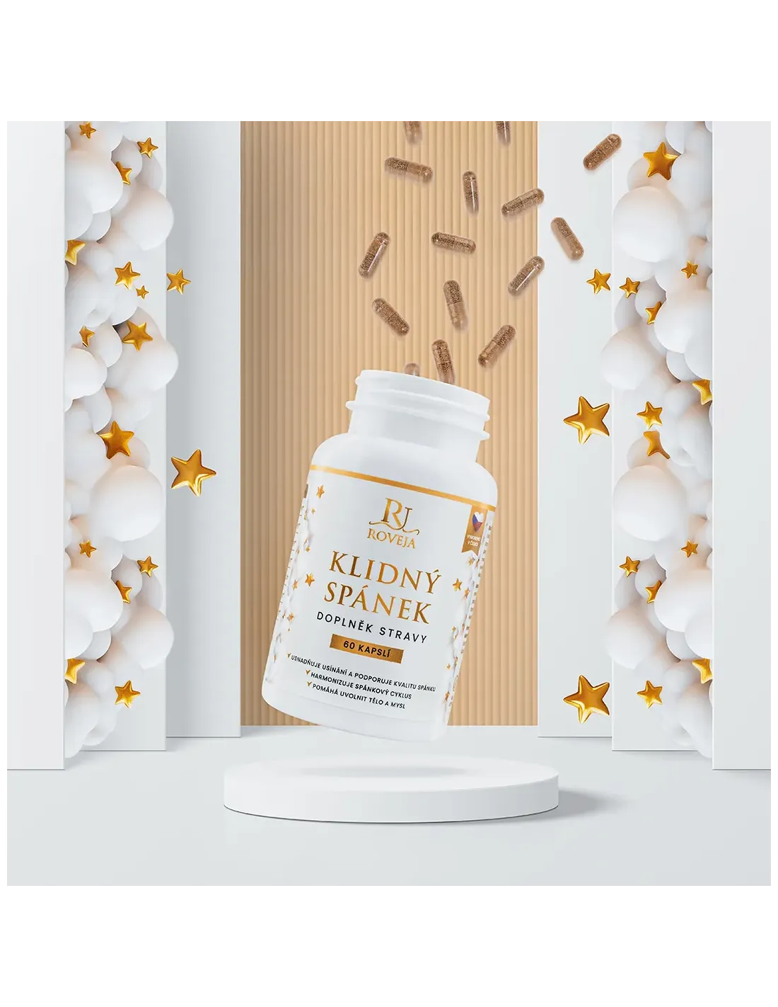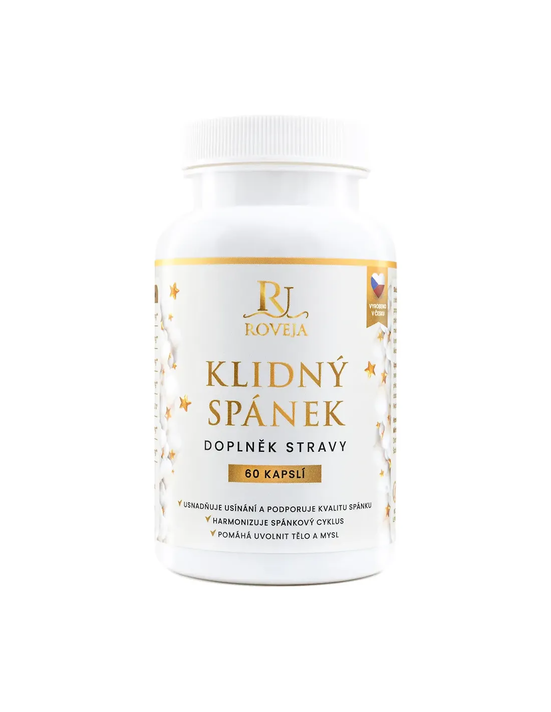 Klidný spánek od Roveja kombinuje osvědčené bylinky (kozlík, mučenka, meduňka, levandule) s L-theaninem, GABA a hořčíkem (bisglycinát) – pro rychlejší usínání, hlubší spánek a efektivní noční regeneraci.