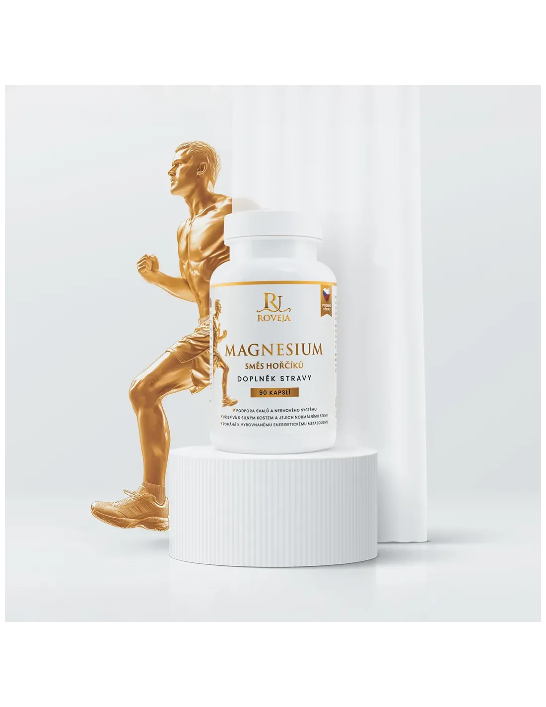 Magnesium směs od Roveja v balení na 60 dní – komplexní podpora při únavě, stresu, svalových křečích a potížích se spánkem. Obsahuje čtyři špičkové formy hořčíku (bisglycinát, taurát, malát, citrát), doplněné o vitamín B6, D3, L-theanin a Bioperine®.